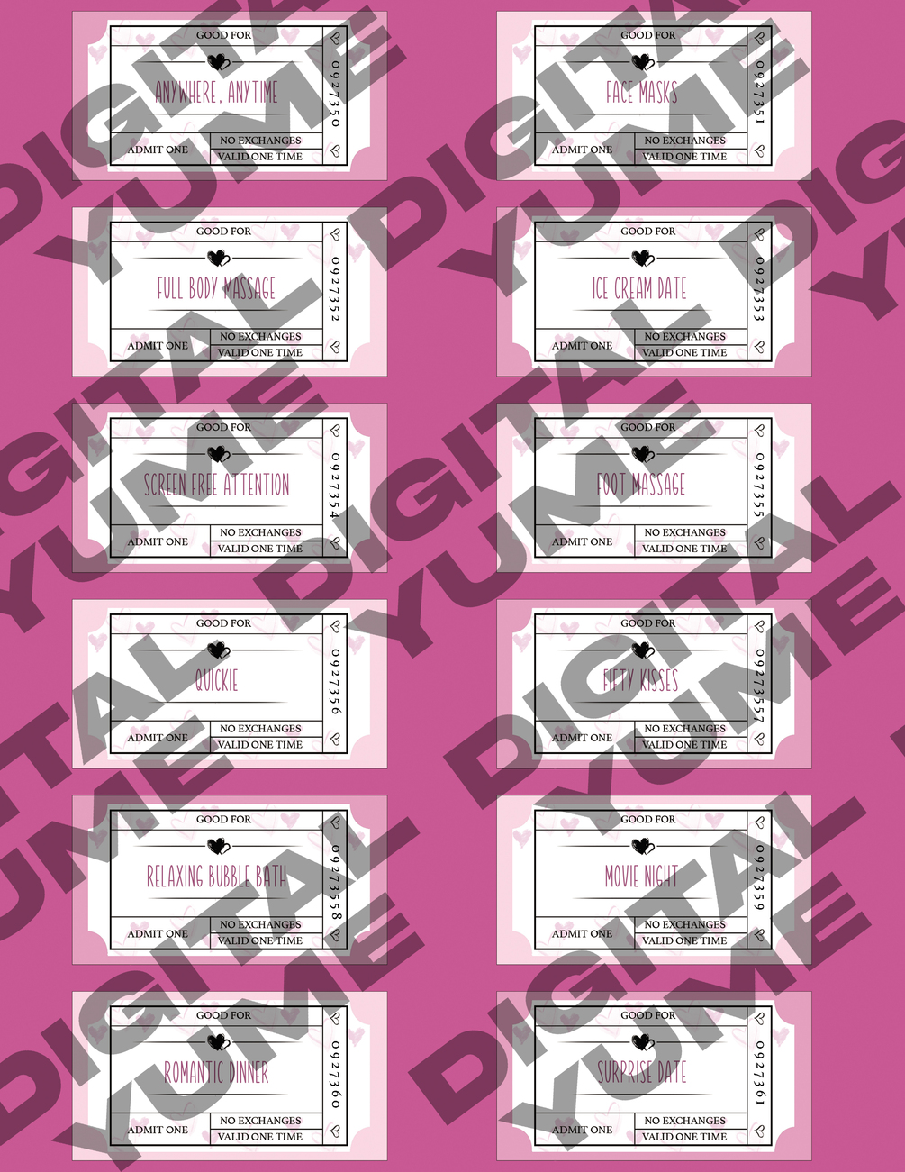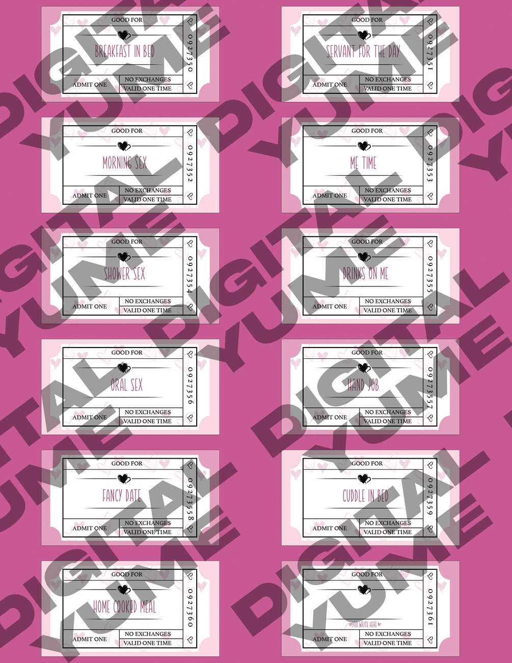The purchase comes with 2 downloadable and printable PDF files which contain 24 total love coupons for your significant other to enjoy.